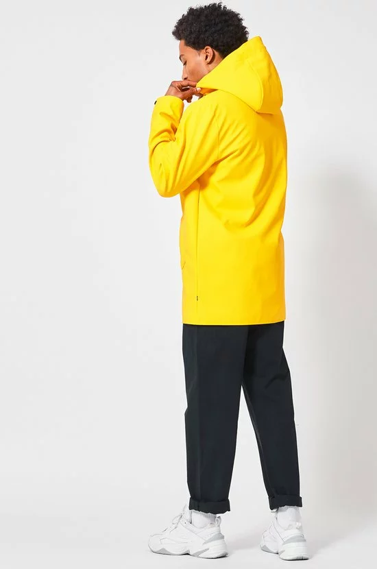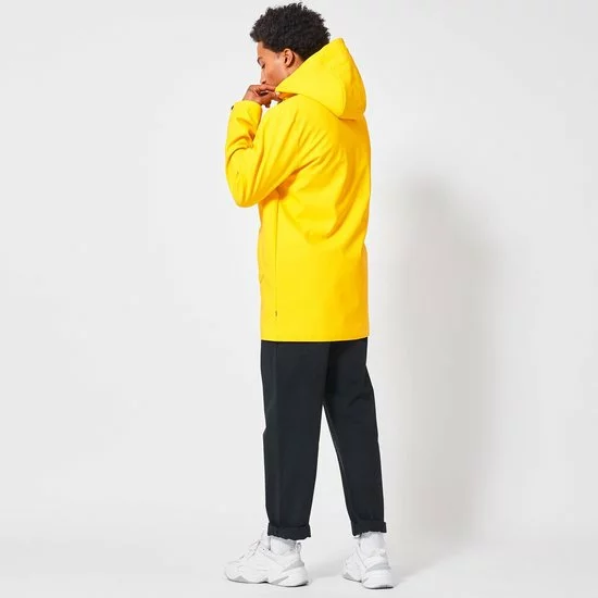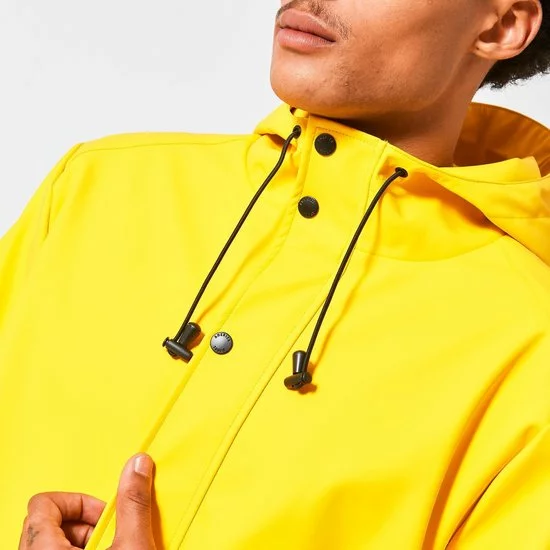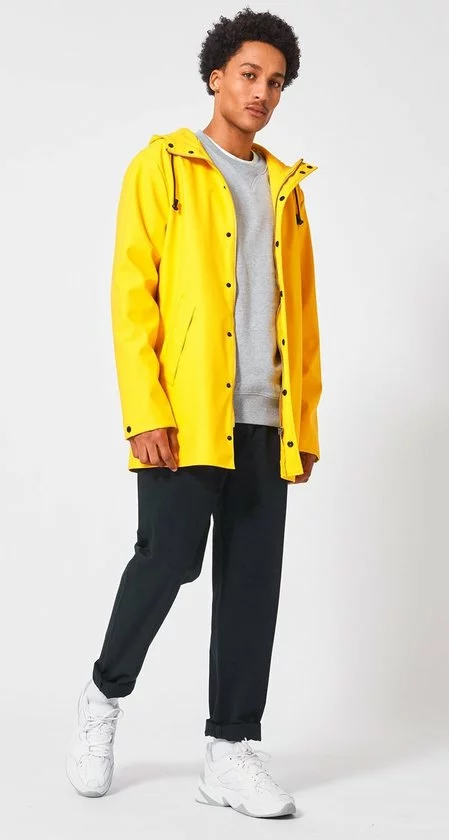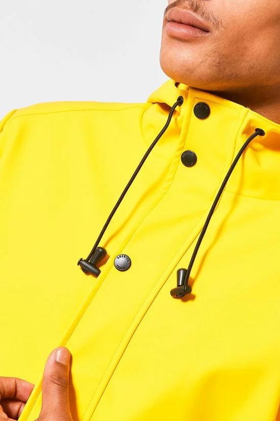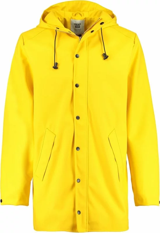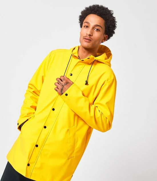 America Today regenjas. De Jace regenjas voor heren van gerecycled polyester is voorzien van een rits- en drukknoopsluiting, vaste capuchon met trekkoord, twee steekzakken en binnenzak met drukknoopsluiting. Het model valt halverwege het bovenbeen en is waterafstotend. De Jace is gemaakt van +-20 plastic waterflesjes. Ons model is 188 cm en draagt maat L.