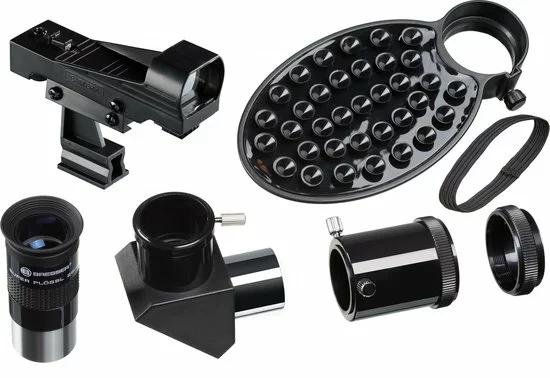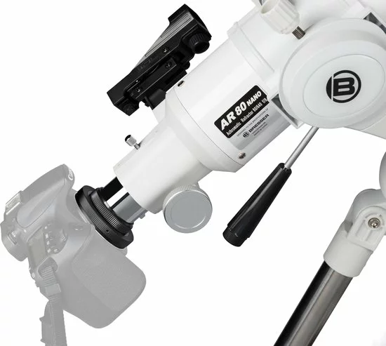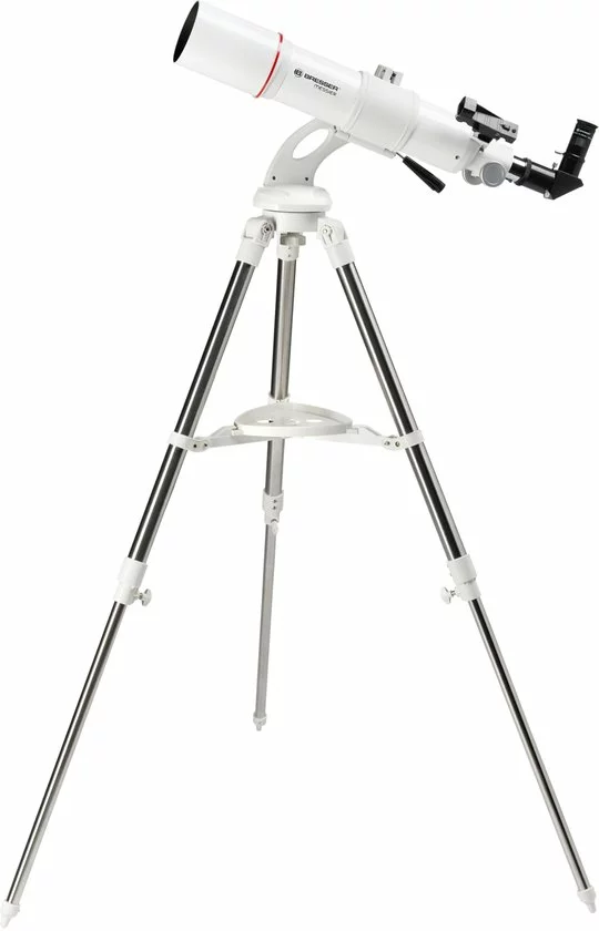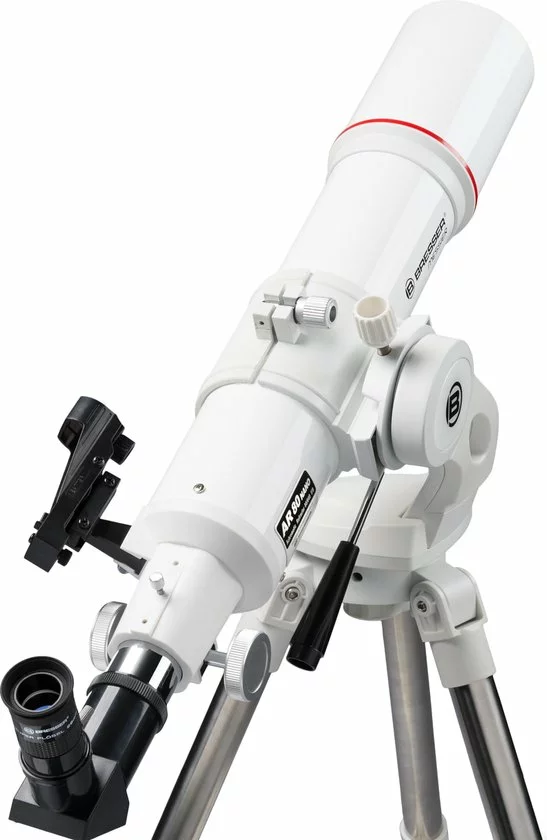 De telescoop wordt bijna volledig voor gemonteerd geleverd met een breed scala aan accessoires, zo kan men snel beginnen met observeren. De Bresser Nano AZ montering is een lichte tot middelzware azimutale montering met statief die ontworpen is om kleine tot middelgrote refractors zoals de AR-90s, AR-102s, AR-102xs en de ED-80 APO snel en gemakkelijk te kunnen plaatsen. Lichtgewicht en snelle, kleine newtonians passen ook goed bij de Bresser Nano AZ montering. Zolang de telescoop niet meer dan 8 kilo weegt en voorzien is van een Vixen-Style zwaluwstaart. Het roestvrijstalen statief dat standaard bij de Bresser Nano AZ wordt geleverd, heeft verstelbare poten en een brede voetafdruk, waardoor het statief zeer stabiel is. De meegeleverde accessoire plaat wordt ingenieus vergrendeld tegen de binnenkant van de statiefpoten zodat het statief nog verder vast gezet wordt en trillingen tot een minimum te perkt worden.