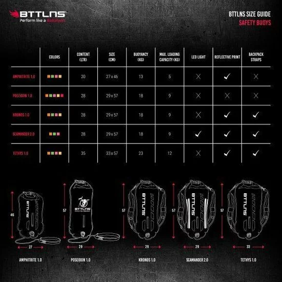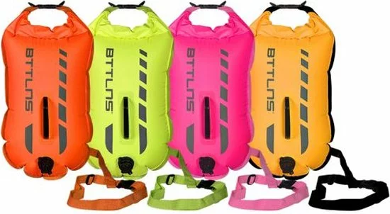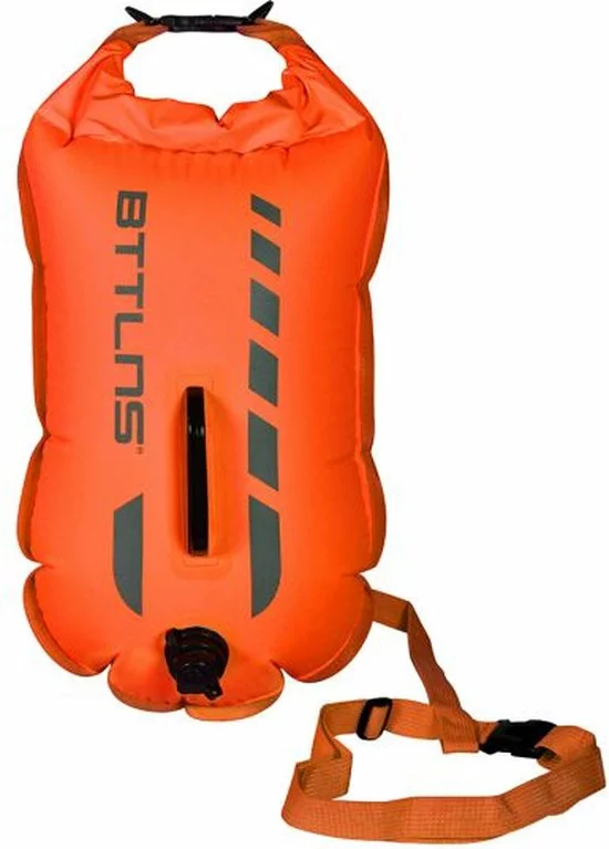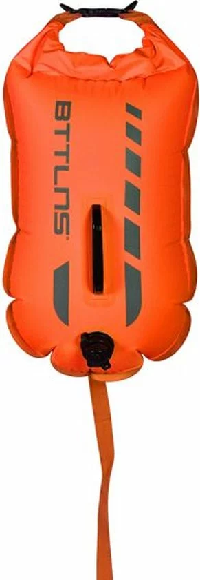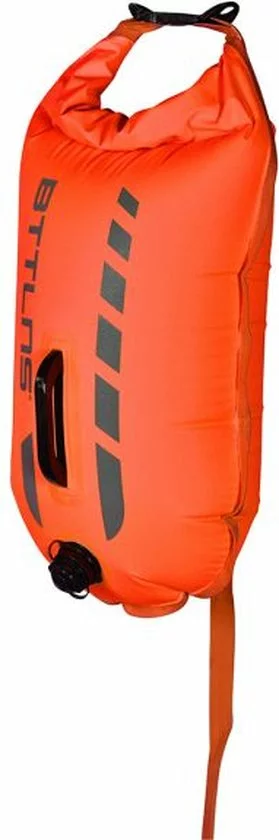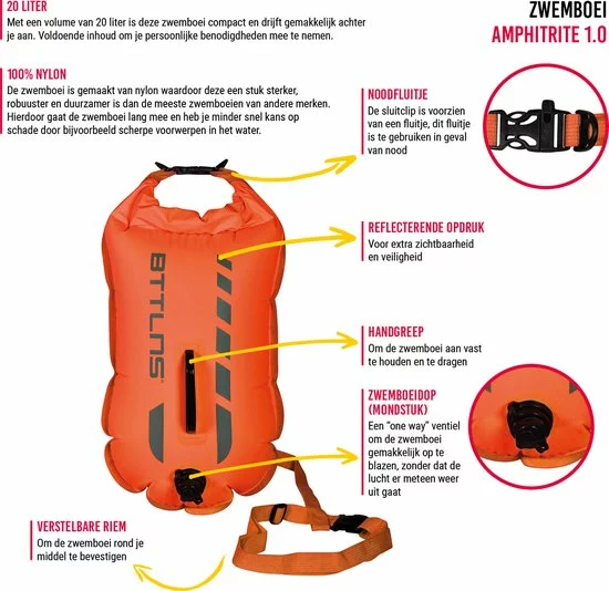 Kenmerken:- Twee opblaasbare luchtkamers die zorgen voor extra veiligheid en meer drijfvermogen dan een normale zwemboei- Het BTTLNS logo is reflecterend voor extra zichtbaarheid- Op de boven- en onderzijde van de zwemboei zit een handvat- De Amphirite wordt standaard geleverd met koord in de kleur van de zwemboei- Uitgevoerd met een reddingsfluitje waardoor u zeer snel en eenvoudig een noodsignaal kunt afgeven voor hulp- Verstelbare dubbele riem voor bevestiging om uw middel en het verlengstuk zorgt ervoor dat de droge tas buiten het zwembereik blijft- Ideaal voor alle open water zwemmers om hun uitrusting en waardevolle spullen tijdens het zwemmen mee te nemen- Sterk aanbevolen voor alle zwemmers voor extra zichtbaarheid tijdens het (openwater) zwemmen- Wordt standaard geleverd met koord in de kleur van de zwemboeiSpecificaties:- Capaciteit: 20 liter- Drijfvermogen: 13 kg- Maximale laadgewicht: 5 kg- Afmetingen: 34 x 61 cm- Materiaal: 100% nylonInstructies:Volg deze instructies en veel sportplezier met deze Amphitrite 1.0 saferswimmer!- Zorg ervoor dat de tas voor gebruik volledig leeg is- Vul de tas met de gewenste uitrusting (die men tijdens het zwemmen mee wil nemen)- Rol de bovenkant op (naar beneden) totdat men het vouwbare gebied punt bereikt- Klip de twee uiteinden aan de bovenkant aan elkaar vast- Blaas de mondstukken aan beide zijdes op- Bevestig het verlengstuk van de taille band aan de clip die aan het einde van de dry bag zitTip: berg de boei in een droge ruimte op en vermijdt scherpe voorwerpen. Voor extra veiligheid/zekerheid, plaats uw elektronische artikelen en waardevolle spullen in een waterdicht tasje en duw deze in de dry bag.Waarschuwing: deze zwemboei is GEEN reddingsmiddel. Open water zwemmen is een gevaarlijke sport. Zwem nooit alleen, zwem altijd samen met een buddy of zwem met een groep.