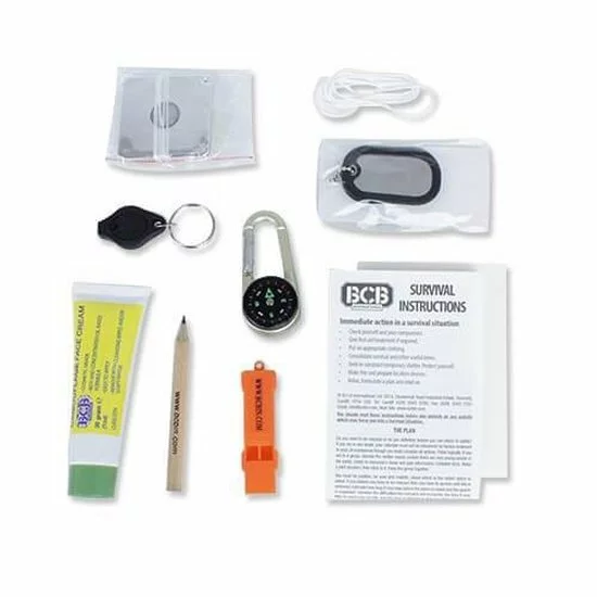 De kit bevat 2 militaire dog tags, groene camouflage gezichts cream (30 grams buis), luid noodfluitje, waterdichtpapier met een potlood, een blauwe micro LED zaklamp, 3 in 1 karabiner, kompas met thermometer, overlevingsinstructies en een 2 inch noodsignaalspiegel.