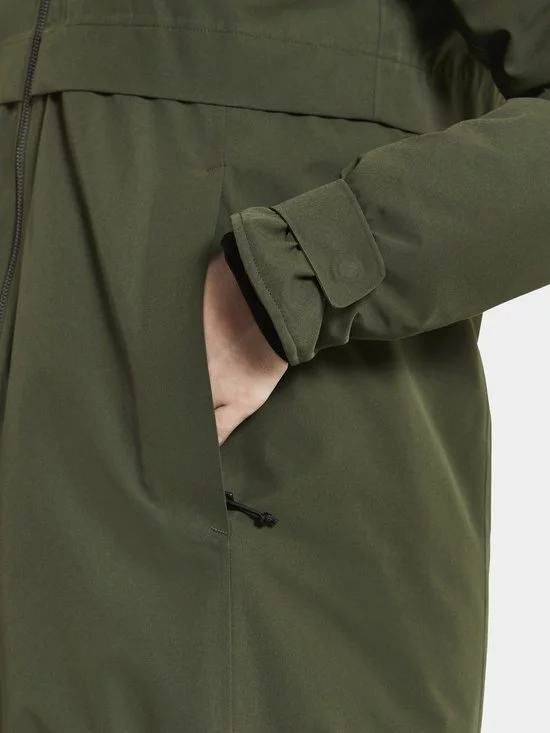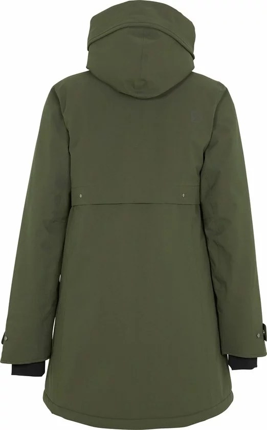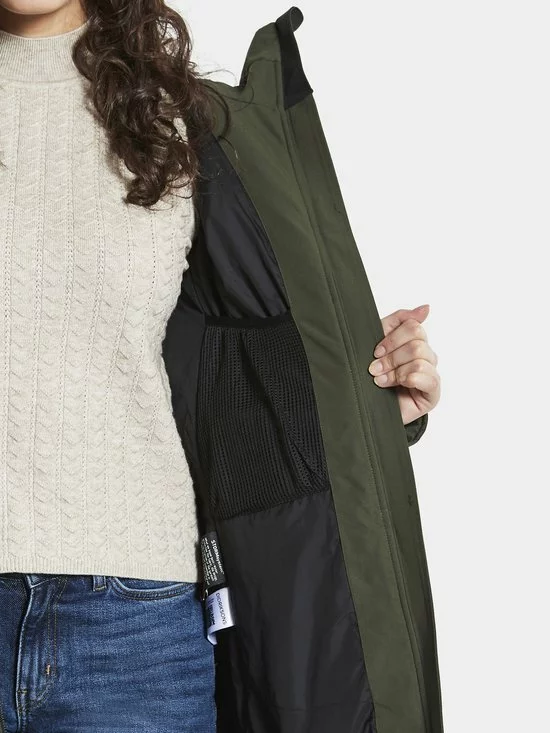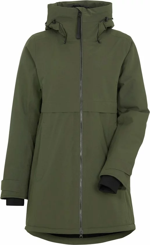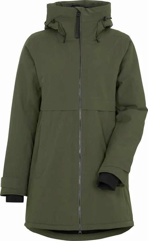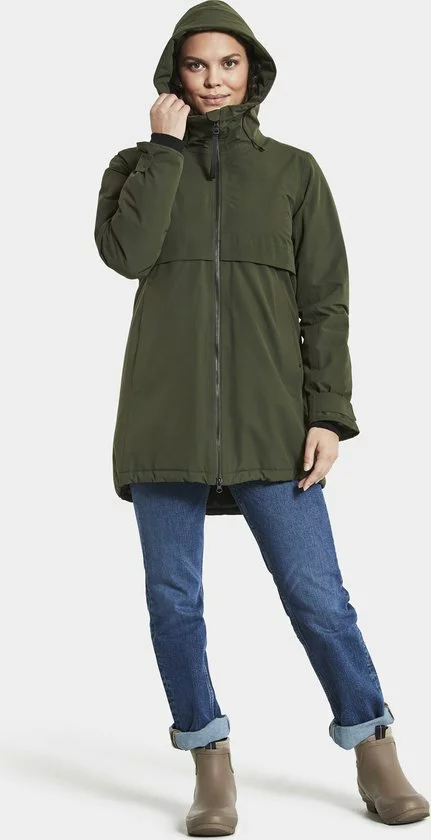 Klassieke Didrikson-parka met vaste capuchon, licht gewatteerd, voor dagelijks gebruik. Ontworpen voor de persoon die houdt van een vrouwelijke vorm met gemiddelde breedte over de taille., Zacht polyester weefsel met dof oppervlak (katoen touch) Kleur: 060 Zwart, 999 Dk Nachtblauw, 300 Diepgroen – Solution dyed, Regular fit /Figuur gevormd, licht achtergrond, juk onder de borst en aan de achterkant met metalen klinknagels.