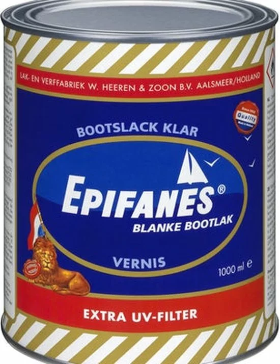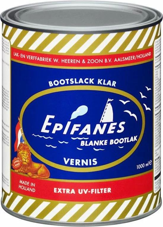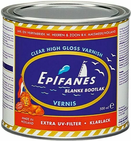 Epifanes blanke lak 0.5 liter. Traditionele hoogglanzende 1component blanke bootlak op basis van houtolie/fenol en alkydhars. Optimale vloeiing, zeer hoge weer en waterbestendigheid, hoge bolle glans en langdurig glansbehoud. Ook in tropische klimaten. Het extra ingebouwde UV filter voorkomt verkleuring van het hout. Het hoog elastisch vermogen voorkomt barst vorming op werkend hout. Kleur: Transparant-amber. Overschilderbaar na 24 uur bij een temperatuur van 18 graden Celsius.