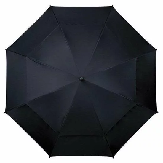 Zwarte storm paraplu extra sterk met een extra stevig dubbel frame van glasfiber en een rubber gecoat handvat met pvc huls. De paraplu heeft een diameter van ongeveer 130 cm en een lengte van ongeveer 96 cm. Mechanisme: handopening. Materiaal: polyester.