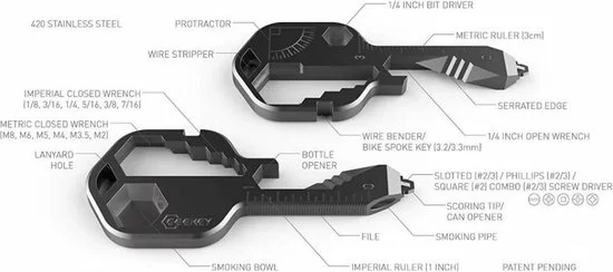 - Diverse handige functies zoals: schroevendraaier voor zowel platte als kruiskop, flesopener, vijltje, spakenspanner, draadstripper, 1/4 inch bit houder en ringsleutel 4/6/7/8/10/13 mm.