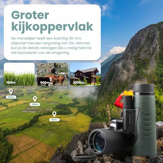 - Zoom in tot in detail met de 12x vergroting β Door de ruime vergroting kun je objecten tot wel 5000 meter dichtbij halen en tot in detail bekijken. Andere monokijkers hebben vaak een vergroting tot 8x, wat ervoor zorgt dat objecten onduidelijk en ver weg blijven. Met de monokijker van L.O.B. GOODS is dit dus geen probleem!
