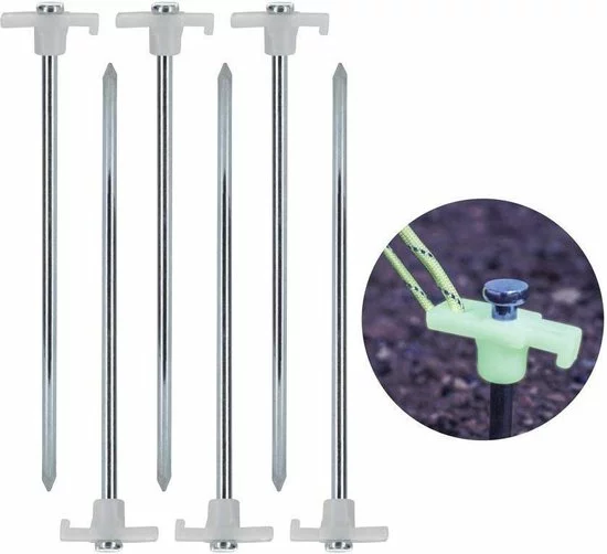 Nooit meer struikelen over uw tentharingen wanneer u in het donker naar uw tent toe loopt. Met de stalen haring met lichtgevende kop van 23 centimeter lang, kunt u gemakkelijk om de haringen heen lopen. Ook kunt u gemakkelijk uw tent terug vinden dankzij de haringen. De haringen zijn glow in the dark en moeten van te voren minimaal 3 uren in de zon worden gelegd.