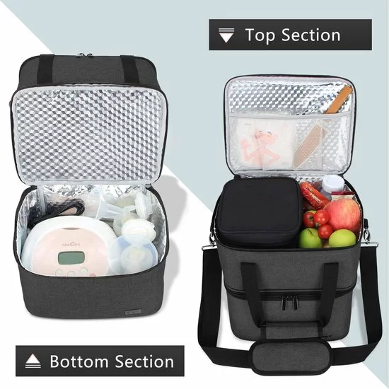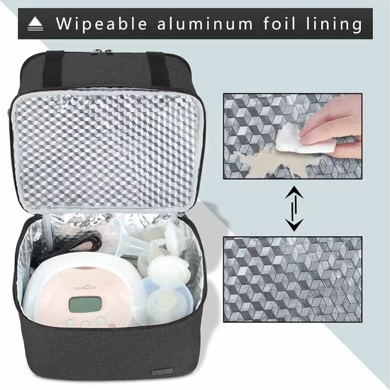 - Functioneel: 2 hoofdgeheugendelen met afwisbare aluminiumfolie. Het bovenste vak dient voor het opbergen van koeltassen en snacks. Het onderste deel dient voor het plaatsen van de borstkolf en de accessoires. (Geschikt voor Spectra S1, S2 en Medela koeltas)