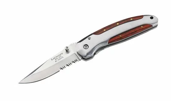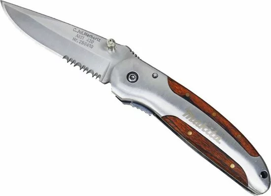 * Hoogwaardige afwerking * Ergonomisch gevormde handgreep * Riemclip inbegrepen * Met praktische koordlus: voor veilig transport * Kan door rechts- en linkshandigen met slechts één hand worden geopend Het eenhandige mes van Herbertz heeft een hoogwaardig lemmet van AISI 420 kwaliteitsstaal, een handvat van pakkahout met een frame van roestvrij staal en een liner lock. Het mes is een geslaagd model met een ergonomisch gevormd heft en een uitgebalanceerd lemmet met gedeeltelijke zaagvertanding. Een praktische riemclip is bij de levering inbegrepen. Het mes kan met één hand worden geopend dankzij de openingshulp. In gebruik bij ambachtslieden, maar ook in de vrije tijd, waarderen niet alleen messenkenners het feit dat bij het openen van het vouwmes één hand vrij blijft voor andere activiteiten. Afmetingen: ca. 17,9 cm Lengte handvat: ca. 10,3 cm Lengte van het lemmet: ca. 7,6 cm Bladhoogte: ca. 2,2 cm Dikte van het blad: ca. 2,9 mm Materiaal: Lemmet: AISI 420 kwaliteitsstaal (roestvrij). Handvat: roestvrij stale
