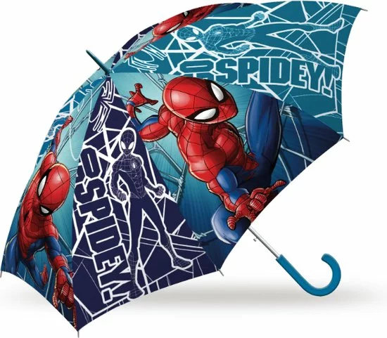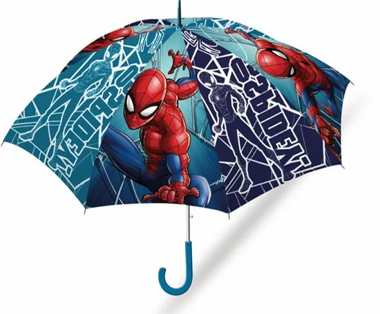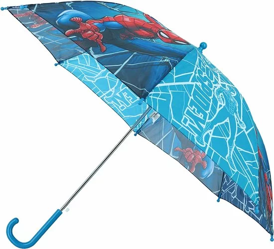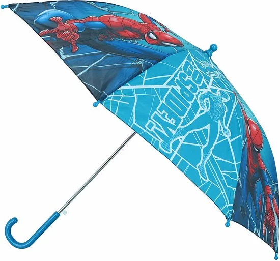 Een stoere paraplu voor een stoere jongen. Met deze donkerblauwe Spider-Man-paraplu sluipt jouw zoontje het huis uit. Niets houdt hem tegen om de slechteriken te vangen, ook de regen niet. Spider-Man houdt boven op de paraplu een oogje in het zeil. De paraplu heeft de kleuren van de superheld: blauw en rood. Aan het ronde handvat houdt je zoontje de paraplu makkelijk vast. Om te voorkomen dat je kleine man zich aan de paraplu bezeert, zitten er ronde dopjes onderaan de baleinen.