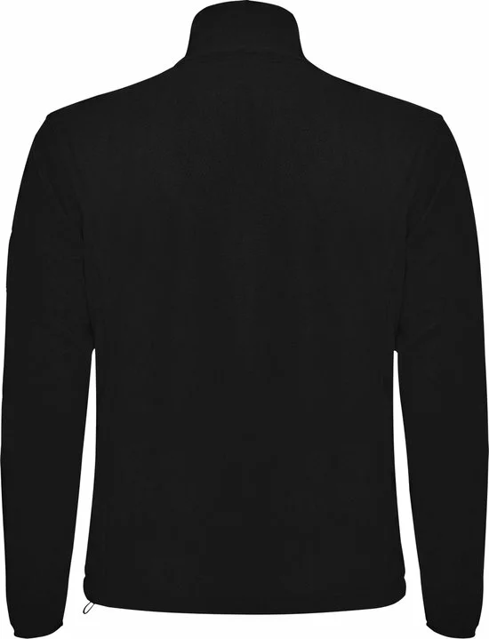 Fleecejas voor buitensport, met staande kraag en lange mouwen met biezen in gelijke kleuren. Zak met rits in linkermouw en centrale rits, allebei in gelijke kleur. Zijnaden.