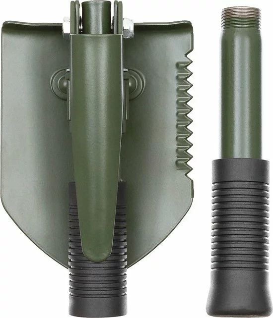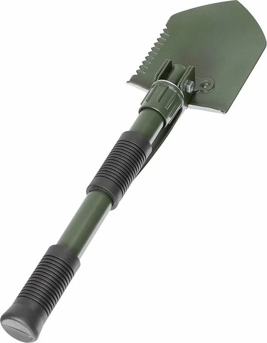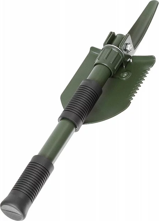 Klapschep 3 in 1, te gebruiken als schep, zaag en houweel met robuuste schroefsluiting en anti-slip rubber handgrepen. Wordt geleverd met hoes met broekriemlus.