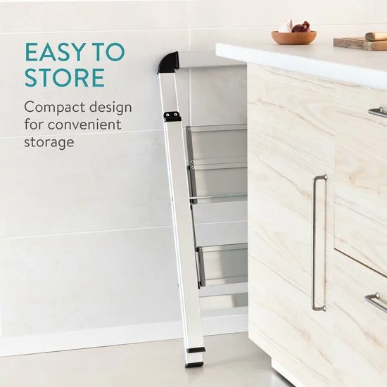 - PRAKTISCH: De huishoudtrap is gemaakt van robuust aluminium. Daardoor is hij erg sterk, maar licht tegelijkertijd (3,76 kilo). Daarnaast is hij makkelijk op te bergen omdat hij inklapbaar is.