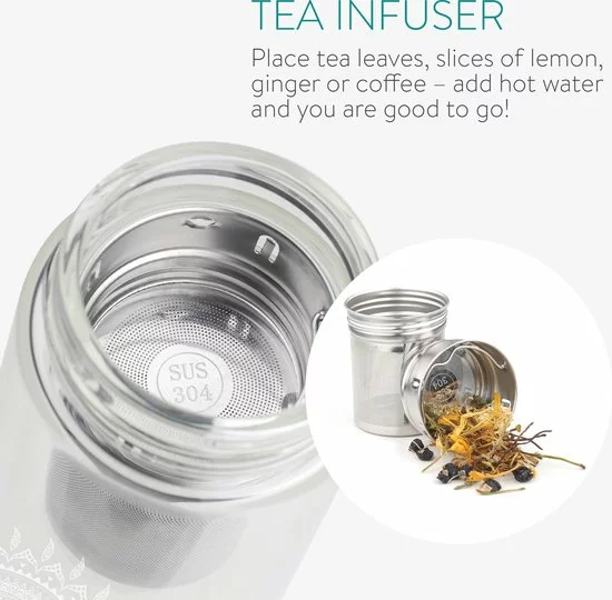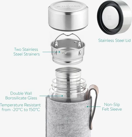 - VOOR ONDERWEG: Neem warme of koude dranken mee voor onderweg in deze glazen fles van Navaris. Met de meegeleverde infuser kun je er verse thee in maken, maar natuurlijk kun je er ook koffie, sap, water of andere dranken in doen.