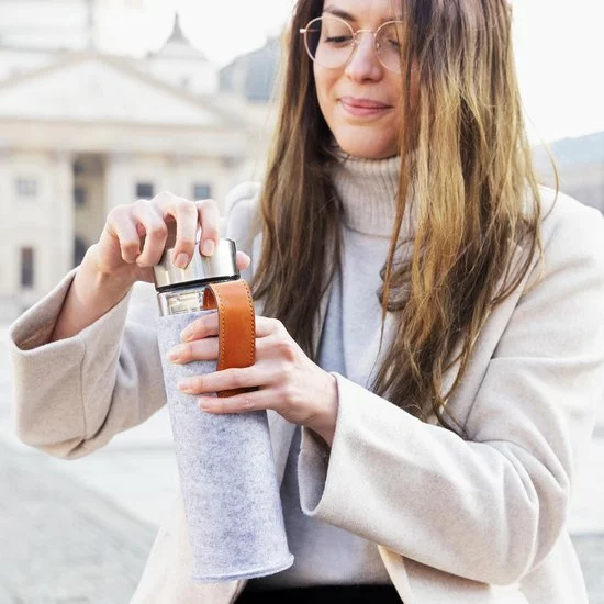 Drink je huisgemaakte thee of koffie on the go met de hittebestendige glazen fles van Navaris.