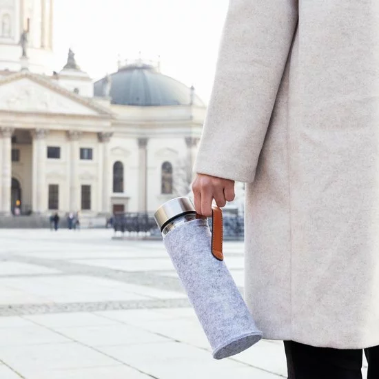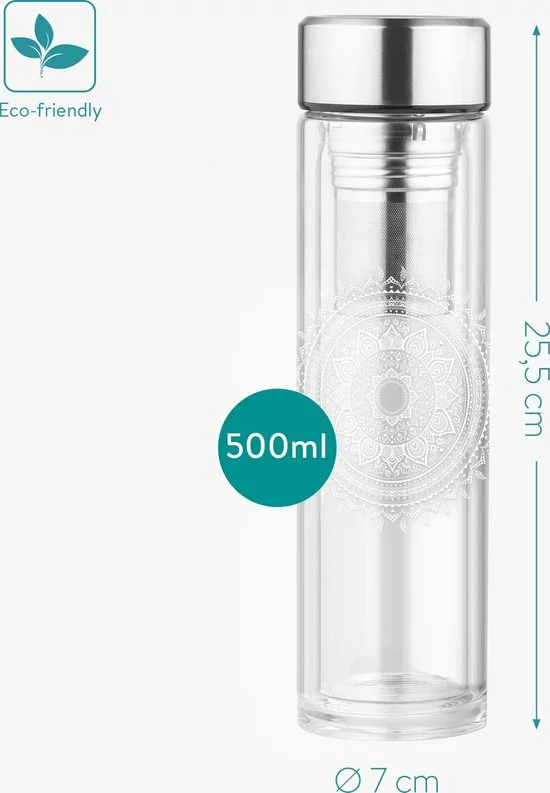 - DETAILS: Je ontvangt één glazen theefles van 25,5 x 7 cm groot met een inhoud van 500 ml. De dop en het theefilter zijn gemaakt van roestvrij staal en de grijze hoes van vilt en imitatieleer. De fles en infuser zijn vaatwasserbestendig.