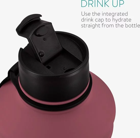 - XL: De drinkfles heeft maar liefst een inhoud van 2,2 liter. Zo heb je altijd genoeg water bij de hand tijdens een intensieve training. Handig in de sportschool tijdens een lesje yoga, pilates, bobybuilding of CrossFit.