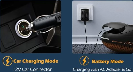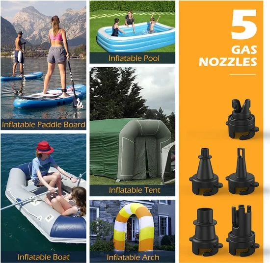 De pomp bevat een oplaadbare 12V LI-ION batterij met een capaciteit van 6000mAh. Daarnaast kan het ook aangesloten worden op de 12V sigarettenaansteker in je auto. Met de verschillende aansluitstukken kun je niet alleen een supboard, maar ook bijvoorbeeld een opblaasbare boot, zwembad, tent of luchtbed oppompen.