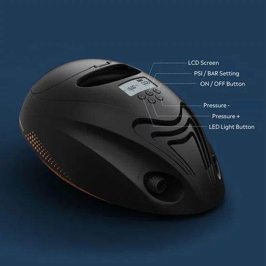 - Het oppompen verloopt in twee stappen waarbij de Auto-Off functie de pomp uitzet wanneer de gewenste druk bereikt is
