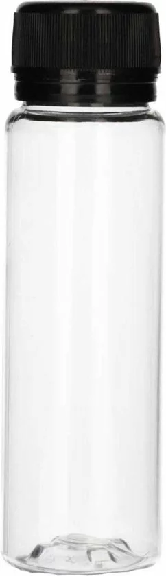 Groothandel π Plasticflessenshop.nl 12 X 75 Ml Juice Mini Shot PET Transparant + Schroefdop Zwart BPA Vrij Kunststof, Hervulbaar, Onbreekbaar, Recyclebaar, Lege Fles β