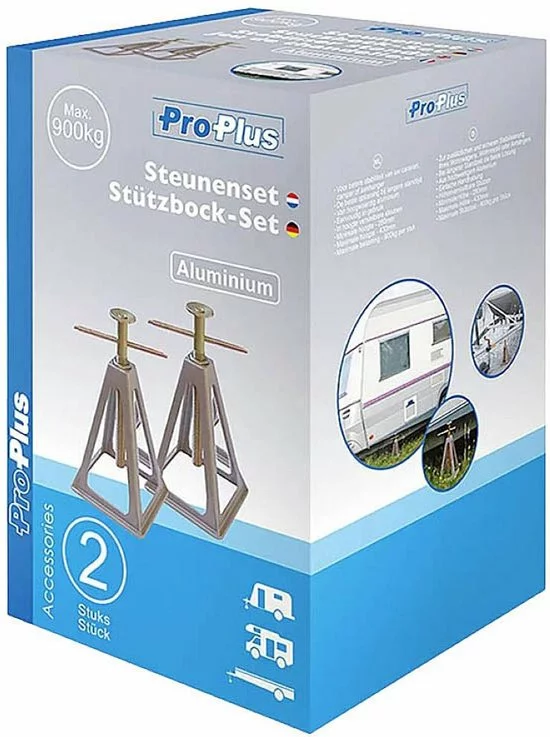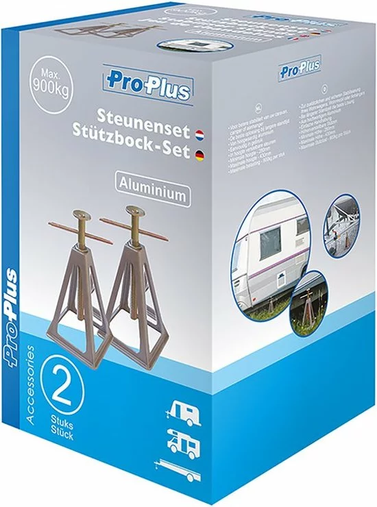 Deze Steunenset van ProPlus zorgt ervoor dat jouw caravan of aanhanger stabiel staat. De steunen zijn gemaakt van aluminium, zijn in hoogte verstelbaar en kunnen per stuk een maximale belasting van 900 kg aan. Geleverd per 2 stuks.