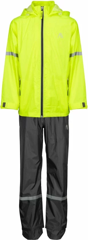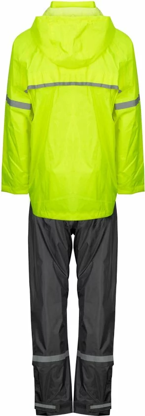 Naast de jas, bestaat het pak uit een waterdichte regenbroek met schoenkappen met klittenband. Met deze schoenflappen worden ook je schoenen of regenlaarzen beschermd tegen de buien en blijven ze schoon en droog. Ook de broek is voorzien van reflecterende details. De broek heeft een sterke elastische tailleband waardoor hij goed blijft zitten en een aansluitende pasvorm heeft. Het gehele pak komt met een handige opbergtas. Zo kun je het weerbestendige pak gemakkelijk opbergen en overal mee naartoe nemen.