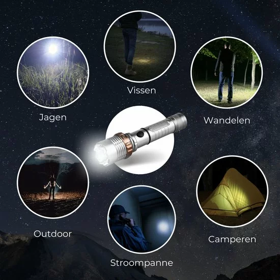 De 1000lumens Aluminium Rechargeable T6 LED Police Flashlight van Rebela heeft een range van 350 meter en heeft vijf standen, High-Mid-Low-Strobe en SOS. Deze zaklamp is speciaal ontwikkeld voor het Jagen, Vissen wandelen, noodgevallen, Camperen, Outdoor activiteiten en ook erg handig bij Stroomuitval