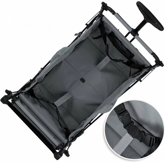 Ook beschikt deze bolderkar over een harde bodem (flexibele plaat verwerkt in de hoes), wat het comfortabeler maakt voor uw kinderen om erin te zitten. Of je nou naar de bossen, strand of op de verharde weg rijdt, hij is overal uitstekend geschikt voor. Wilt u uw bolderkar krasvrij vervoeren of opbergen? Ook geen probleem, door de meegeleverde beschermhoes. De opvouwbare bolderkar is gemaakt van een stevige stalenconstructie. Voor ieder uitstapje is deze bolderkar een must have!