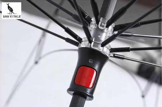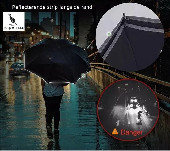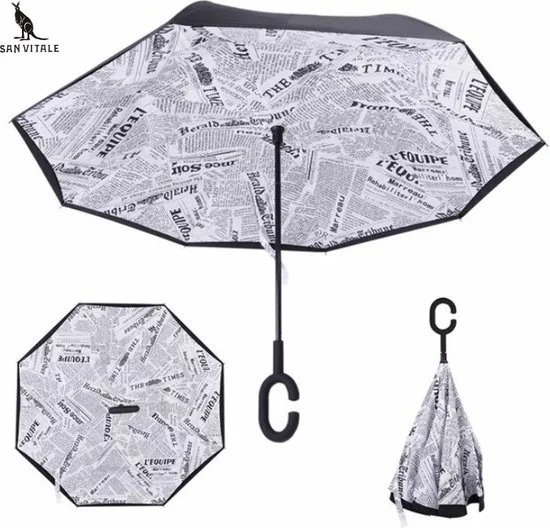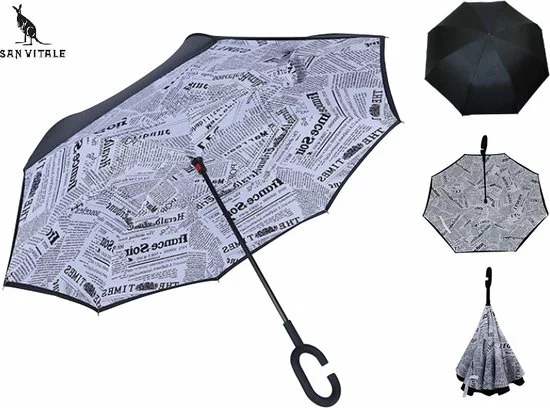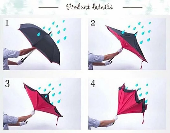 Deze dubbelzijdige paraplu klapt makkelijk open, waardoor het doek omklapt. De buitenste doek wordt zo de binnenste doek. Na het inklappen blijft het water in de paraplu, waardoor er geen water langs de paraplu loopt.