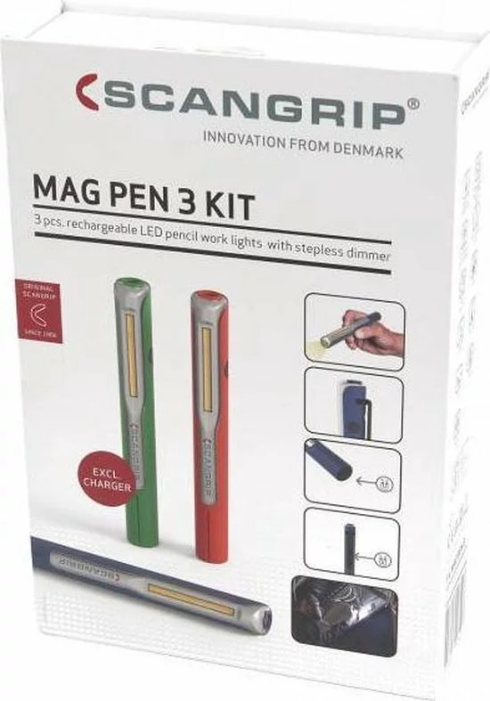Set van 3 oplaadbare LED inspectielampen van Scangrip. De Mag Pen 3 is een compacte en handige zaklamp voor tal van inspectiewerkzaamheden in de werkplaats. Door de draaibare haak en de geΓ―ntegreerde magneten kun je de lamp altijd ophangen of plaatsen waar nodig en heb je je handen vrij. Met de meegeleverde USB-kabel laad je de zaklamp op waardoor je nooit gedoe hebt met het verwisselen van batterijen.
