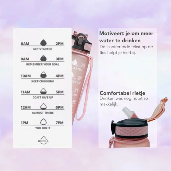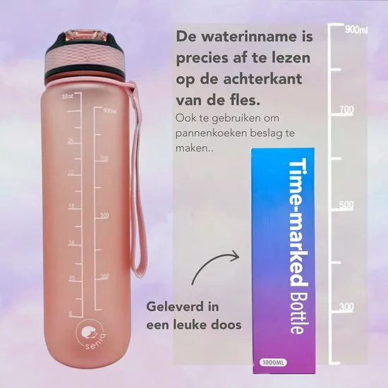 Gemiddeld drinkt 75% van de mensen te weinig water op een dag; meestal wordt er niet actief nagedacht over de waterinname. Daarbij is het soms lastig om goed bij te houden. Toch is water drinken essentieel voor het goed functioneren van ons lichaam. Dagelijks is een waterinname van twee liter aan te raden, De Seniq Motivatie Waterfles helpt jou om dit te bereiken. Door de handige tijdmarkeringen op de fles is het mogelijk om per uur af te lezen wat de aangeraden waterinname is. De motiverende teksten helpen je om iedere dag de aanbevolen twee liter te bereiken.