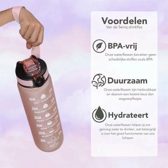 De Seniq Motivatie Waterfles is 100% BPA vrij en gemaakt van hoogwaardig Tritan materiaal.