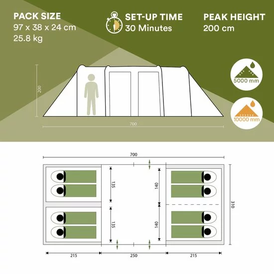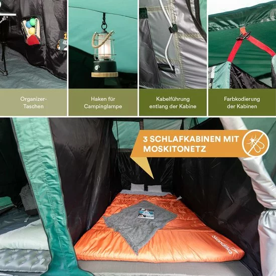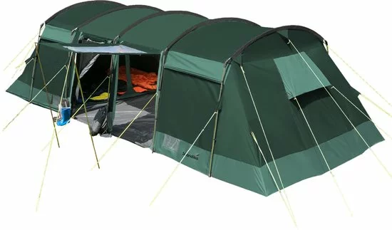 - RUIM: Ruime 8-persoonstent met een comfortabele stahoogte van 200 cm, veel ruimte in het leefgedeelte voor bagage en vrienden en 2-4 slaapcabines: Twee voor twee personen elk en een grotere voor vier personen, maar die ook kan worden verdeeld met een praktische scheidingswand voor een rustgevende nachtrust.