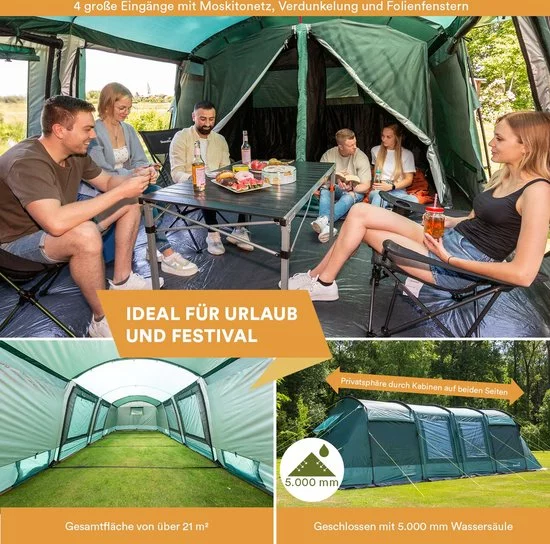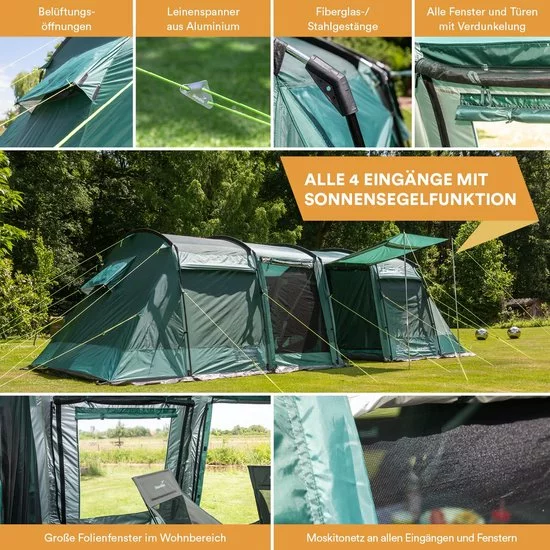 - COMFORT: Enorme 8-persoons kampeertent met 4 ingangen en 2-4 slaapcabines met ademende stof en een eigen ingenaaide vloer en muskietennet voor insecten- en tochtvrij slaapcomfort.