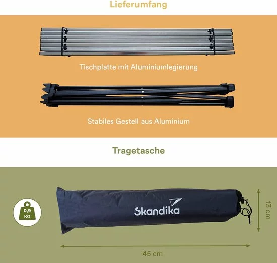- VEELZIJDIG GEBRUIK: De Skandika campingtafel Ruka is geschikt voor veel verschillende gelegenheden β als nachtkastje, balkontafel of klaptafel voor kamperen, koken, wandelen, vissen of op het strand.
