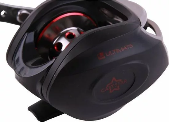 Ultimate CastStar – Druppelreel – Gewicht: 200g – Overbrenging: 7.0:1 – Kogellagers: 3+1 – Lijncapaciteit: 180m/0,26mm – Slinger: links – Kleur: zwart met rode accenten – Hoge overbrenging – Nauwkeurig in te stellen slipsysteem – Compact, sterk en veelzijdig – Gering gewicht maakt deze molens ideaal voor het actief vissen – Perfect voor het vissen op snoek, baars, snoekbaars en forel – Wordt geleverd inclusief luxe hoesDe Ultimate CastStar is niet alleen licht, maar ook enorm sterk en duurzaam. De vier kogellagers maken deze reel erg soepel en daarnaast werpt deze reel superstrak en kan hij voor veel diverse technieken worden ingezet. En met zβn lage prijs is de CastStar een prima instapmodel om te beginnen met het vissen met een baitcaster!