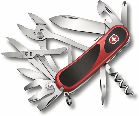 Victorinox EvoGrip S557 zakmes met ergonomisch gevormde soft schalen in rood/zwart met Zwitsers kruis. Alle onderdelen zijn van roestvrij staal. Dit zakmes van 85 mm met 2 locks heeft de volgende 21 functies: lemmet met lock, nagelvijl met nagelreiniger, schaartje met karteling, blikopener met kleine schroevendraaier, flesopener met schroevendraaier met lock en draadstripper, Phillips kruiskopschroevendraaier, combitang met verstelbare opening, draadkrimptang, draadsnijders en moersleutel, universele moersleutel, kurkentrekker, steek en boorpriem, sleutelring, pincet en tandenstoker. Gemaakt met Zwitserse precisie en vakkundigheid, zoals je mag verwachten van de makers van het originele “Swiss Army Knife”. Levenslange garantie. In doosje.